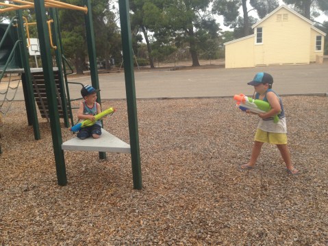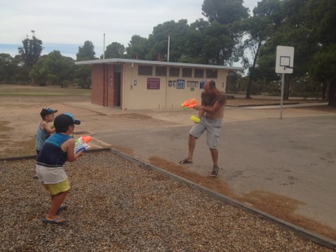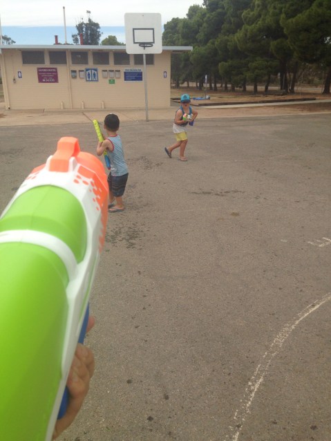 The next day we went into Kadina to swap over solar panels as one of our panels had broken and Matt had made contact with Redarc (the company of the solar panel) and the guy from Redarc understood how important the solar panels are to us and he rang around and organised for us to just go into the nearest town, which had one in stock, and swap it over. Talk about awesome service. It had warmed up by the time we got back and with little shade and no swimming spot there was only one way to cool down. All out war was declared and the water fight started.