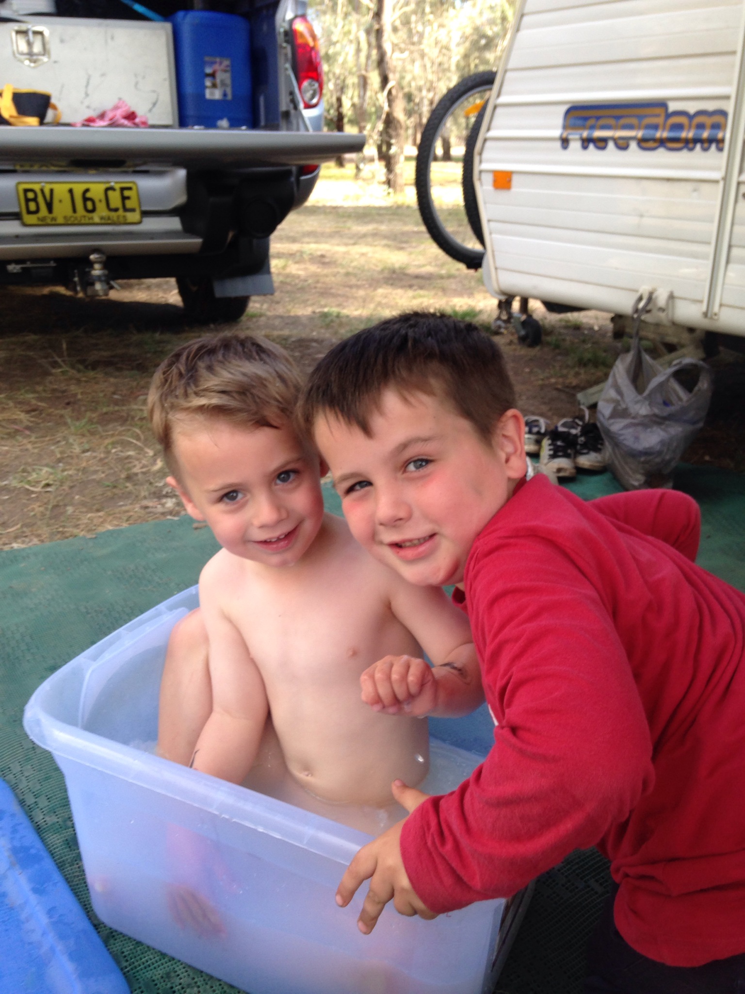Boys decided they wanted to try camp style bath. Nate loved it. Ethan was a bit too big but still liked it.